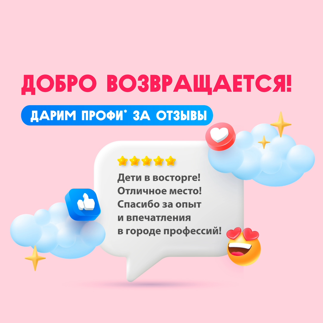 Поделитесь вашими впечатлениями о посещении города профессий, и мы подарим вам 100 профи.